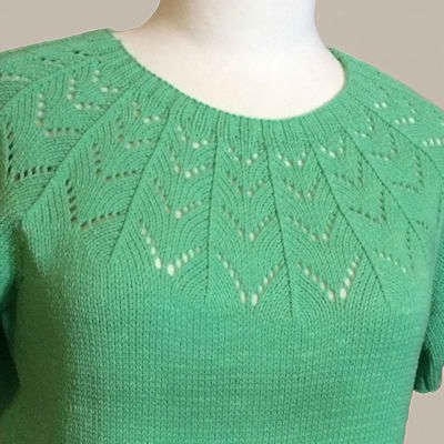 Love lace? You can do it. This ladies’ top was made on an LK 150 basic knitting machine. The eyelets are hand transferred. Ribbing is done by converting stockinet to ribbing, but can be hand knit instead.