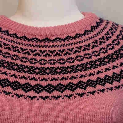 For those who prefer garments made of thinner yarn, standard gauge metal bed machines are a great choice. The Fairisle yoke shown on the right was made with sock weight yarn on a standard gauge punchcard machine.