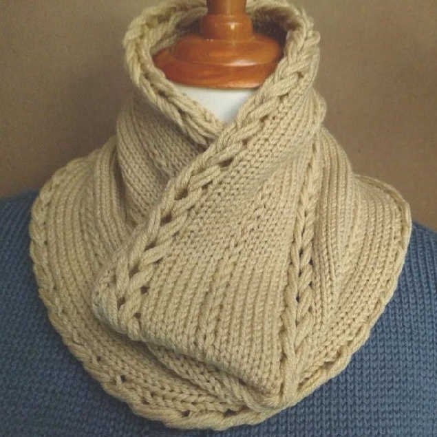 Requires one 100-gram ball aran weight yarn, with number 4 on the ball band, or any yarn that will knit stockinet to a gauge of 4 sts 6 rows = 1”. The fabric should be soft, and fairly loose, since the cowl needs to drape. If you can’t match the gauge, go for a soft, drapey fabric instead.