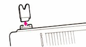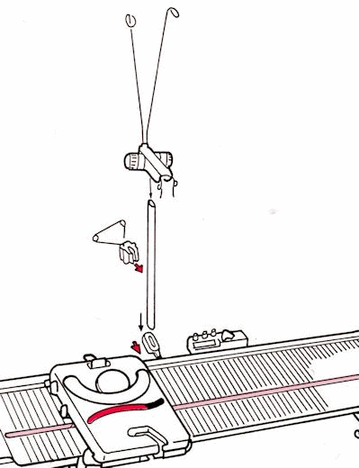 Remove the yarn rod socket and push firmly to insert the prongs into the small square hole at the back of the knitter. You will usually feel a small snap when the prongs go in completely. The socket should be very stable when inserted correctly, and should fit tightly against the back of the needle bed