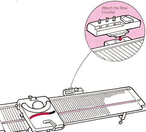 Insert the row counter, with the numbered dial facing forward, and the tab at the bottom going firmly down into the slot on the rear of the machine bed, slightly to the right of the center.