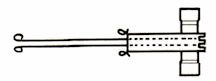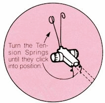 Turn the Auto Tension over and look at the underside of the main section. There is an oval-shaped opening in the center. Now place this opening over the top of the yarn rod, pushing down so that it goes over the yarn rod securely. The antennas should be toward the rear, and the two little curled eyelet wires should be to the front, as the machine faces you.
