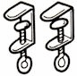 Place the machine flat on the table. Take a clamp out of the box and unscrew until fully open. Turn clamp so that the opening is facing away from you and toward the knitter. Insert the top prong into the left slot on the base of the machine, so that it goes completely into the opening, and the clamp screw goes under the lip of the table. Tighten just until the screw snugs up against the table top. Repeat for right clamp. Now be sure that the knitter is securely attached, with the edge of the machine flush with the edge of the table; tighten screws a bit more if necessary, but don’t use excessive force or you might crack the plastic.