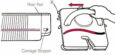 1. Place the carriage level with the needle bed, with the groove at the rear of the carriage, A, in line with the rail at the back of the Needle Bed. Bring the groove on the rear of the carriage over the rail and slide into place.
