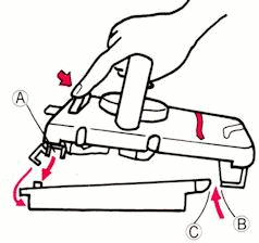 2. Pull the release lever on the back of the carriage forward. While holding it in the forward position, place the Fabric Presser B (the metal unit at the bottom front of the carriage) under the Sinker Posts C (the comb-shaped section on the front of the Needle Bed). Lower the back of the carriage until the groove on the back goes down over the rail on the rear of the Needle Bed, then release the lever.