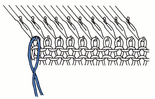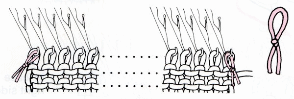 Cut a piece of yarn approximately 6″ long. Do not knot the ends. At the point where you wish a marker, insert the latch tool under the bar between stitches. Catch the fold of yarn, pull it through, then catch both ends of the marker yarn and pull them through the loop. Tighten just enough to hold the marker in place. When you no longer need the marker, pull on the fold of the loop to loosen it, and either snip it or enlarge the loop and pull the ends free.