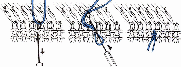 When you need to mark an interior point, such as the division between shoulder and neck, you can use either of the above markers. However, many people find this method works better. The yarn goes between the stitches (in this case, the last shoulder stitch and the first neck stitch).