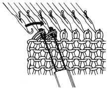 Push needle back so that the yarn strand goes through both yarn loops. This creates a new single stitch on end needle.
