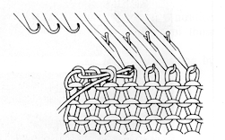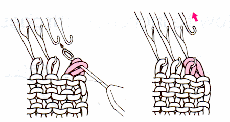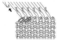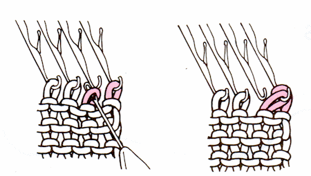 Move the stitch from needle 2 to needle 3; bring the needle forward so that both loops go behind the latch. Place the strand of yarn into the hook of needle 3, push the needle back to form a new stitch. Move the stitch from needle 3 to needle 4.