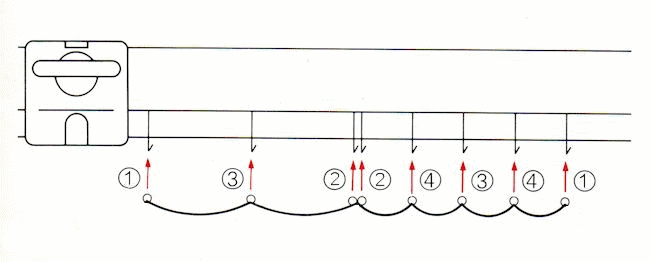 “Guestimate” the middle point of the fabric on the left and hang on the approximate center needle on the left; do the same on the right side. This is point 3 on the illustration.