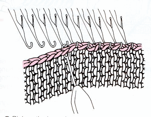 Along the edge there will be a looser stitch, then a tighter stitch; these alternate along the edge. They are frequently referred to as loops and knots. Sometimes the pattern will say something like “pick up 3 stitches per every 4 rows”. You should pick up the first loop, the next knot, the next loop, and skip the next knot. This is 3 stitches every 4 rows, exactly what the directions require. Repeat this sequence throughout.
