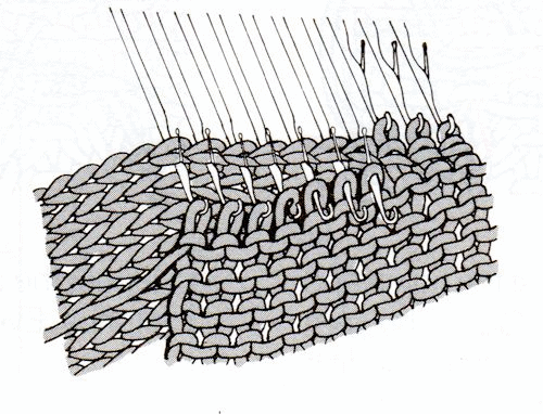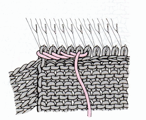 Sleeve stitches should be in the needle hooks. The illustration shows that the waste yarn has been removed after the sleeve stitches are picked up. It is really safer to leave it in place until after the seam is completed. If you should accidentally drop a stitch, it won’t run.