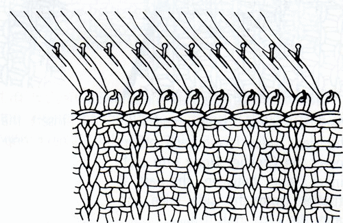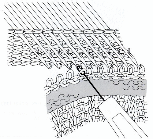 This technique is useful when joining a ribbed band to side edges, such as cardigan button bands, and V necks. Make the ribbing first, then knit 1 row stockinet. Remove on waste yarn.