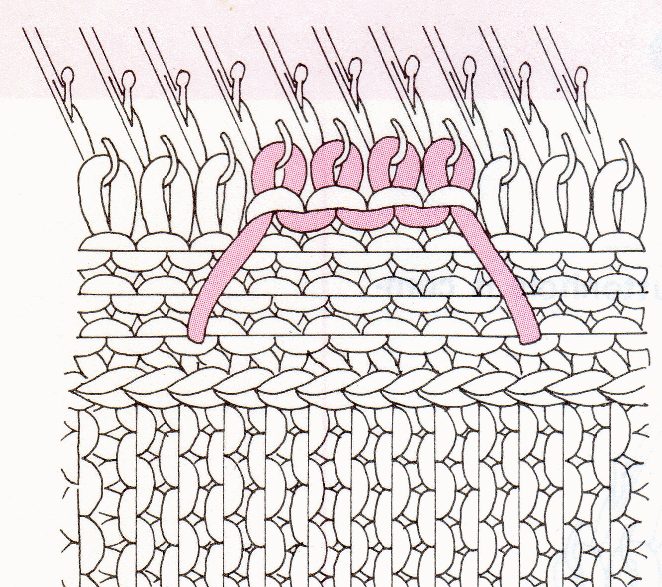Knit 4 more rows. Turn the stitch dial up 2 numbers and knit 1 row. This is the fold line. Knitting at a looser tension allows the fabric to fold more easily. Turn the dial back to original setting. Knit 4 rows. Bring 5 needles all the way forward, then return them to position C. This should be the original buttonhole needles, plus 1 more on the left side. The lighter loops in the illustration are the contrast thread, and the darker loops are actually main color. Because of the way knitted stitches are formed, there is always 1 more on the top side of the cord. The transfer tool shows which ones to pick up.