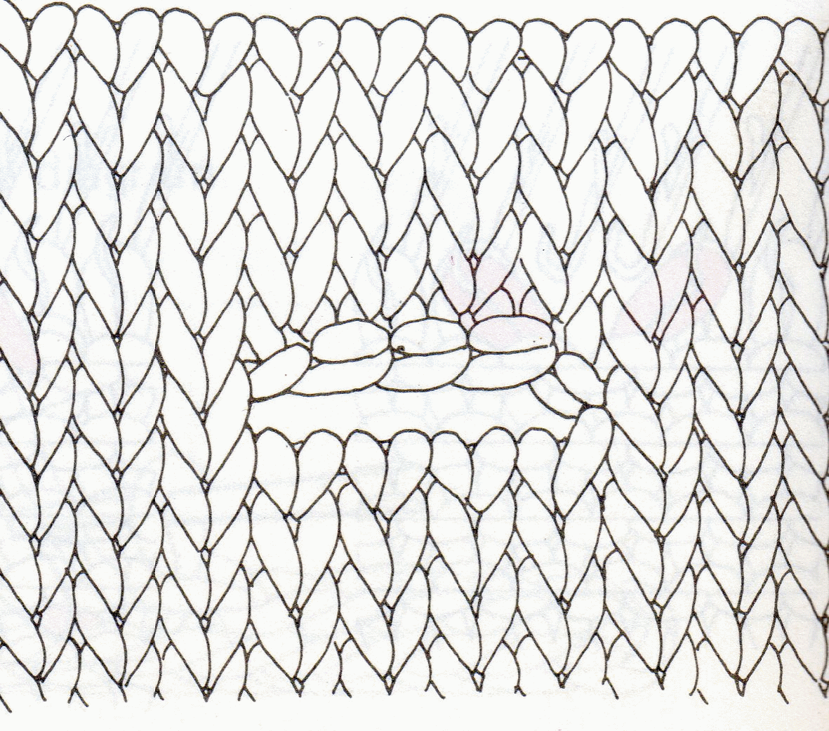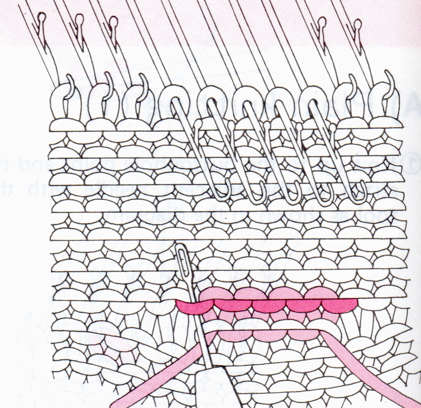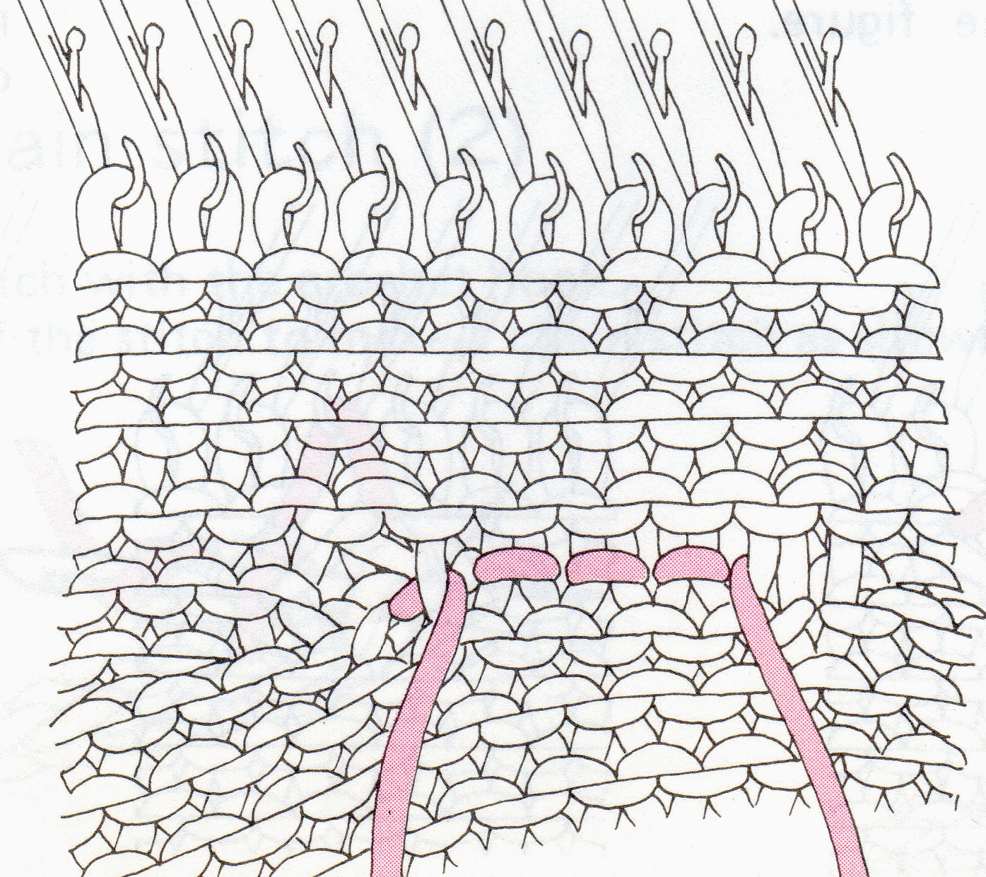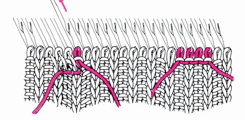 Knit the rest of the band, drop and relatch the ribbing. Do not convert any of the marked stitches (the contrast thread); they need to remain in stockinet.