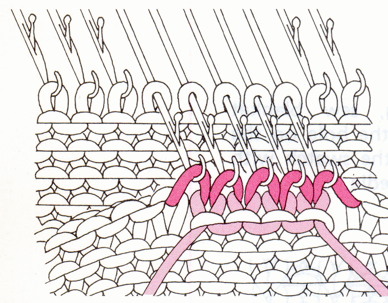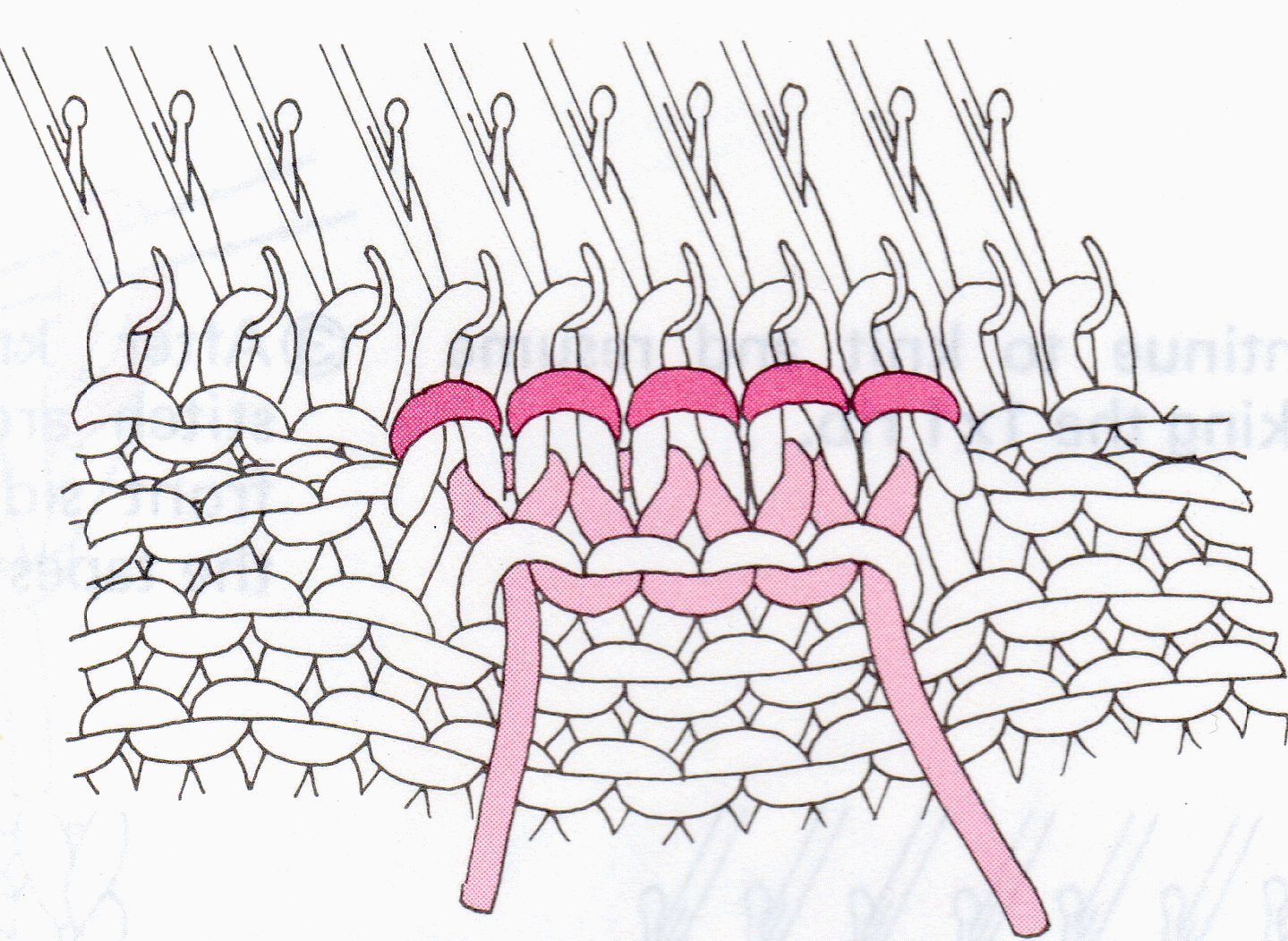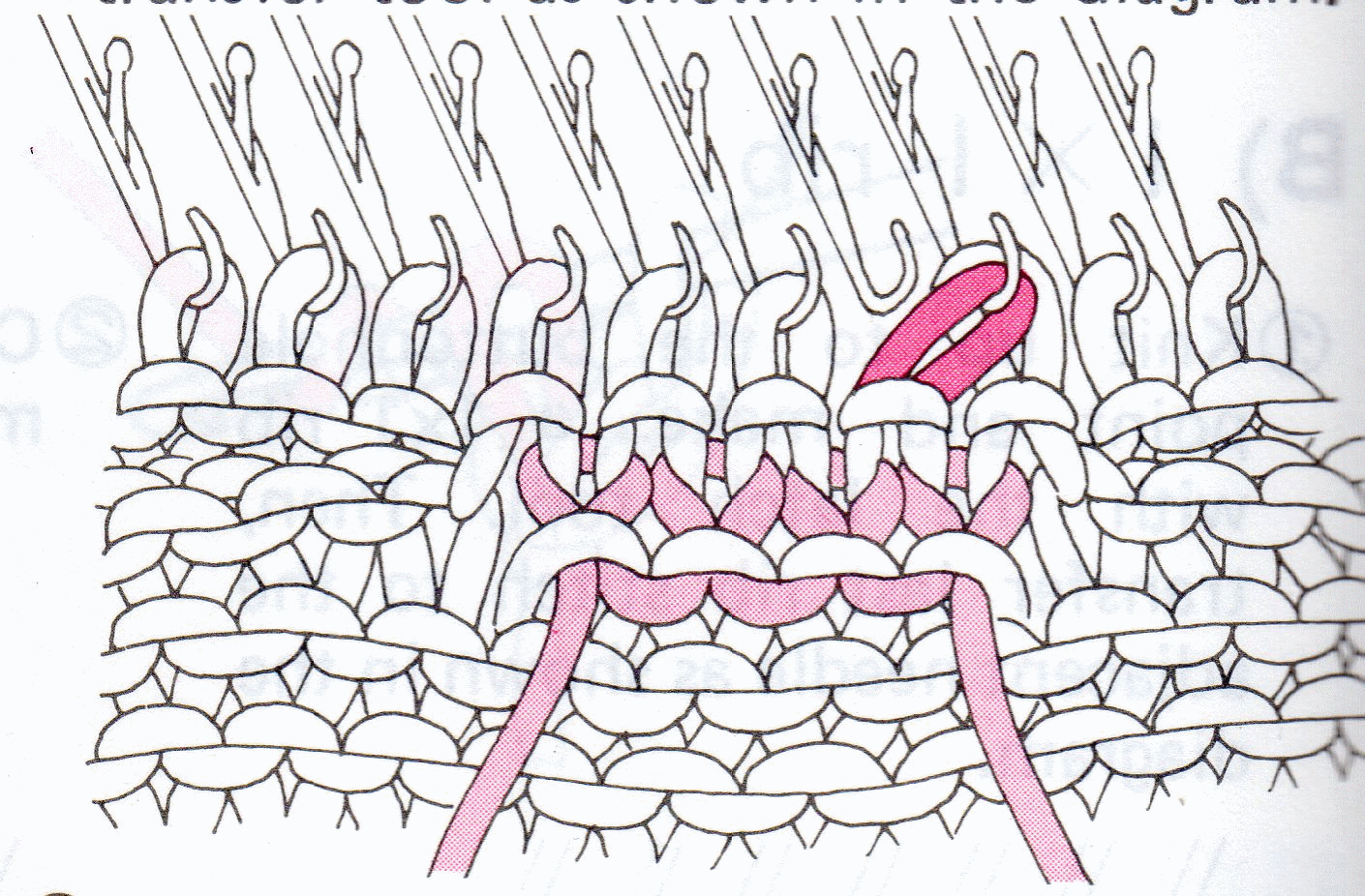 Push these 5 needles back so that the picked up loops go through the stitches. There should now be just one stitch in each hook.
