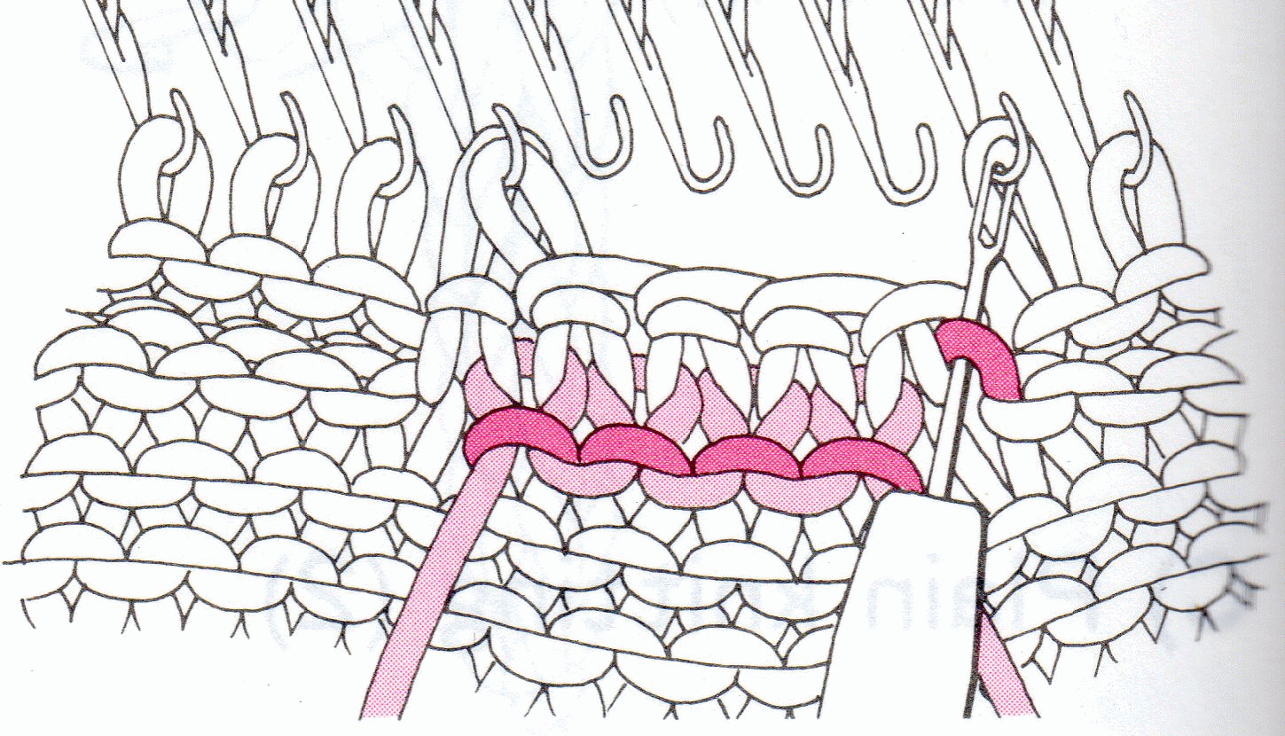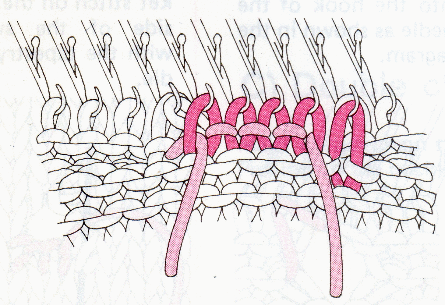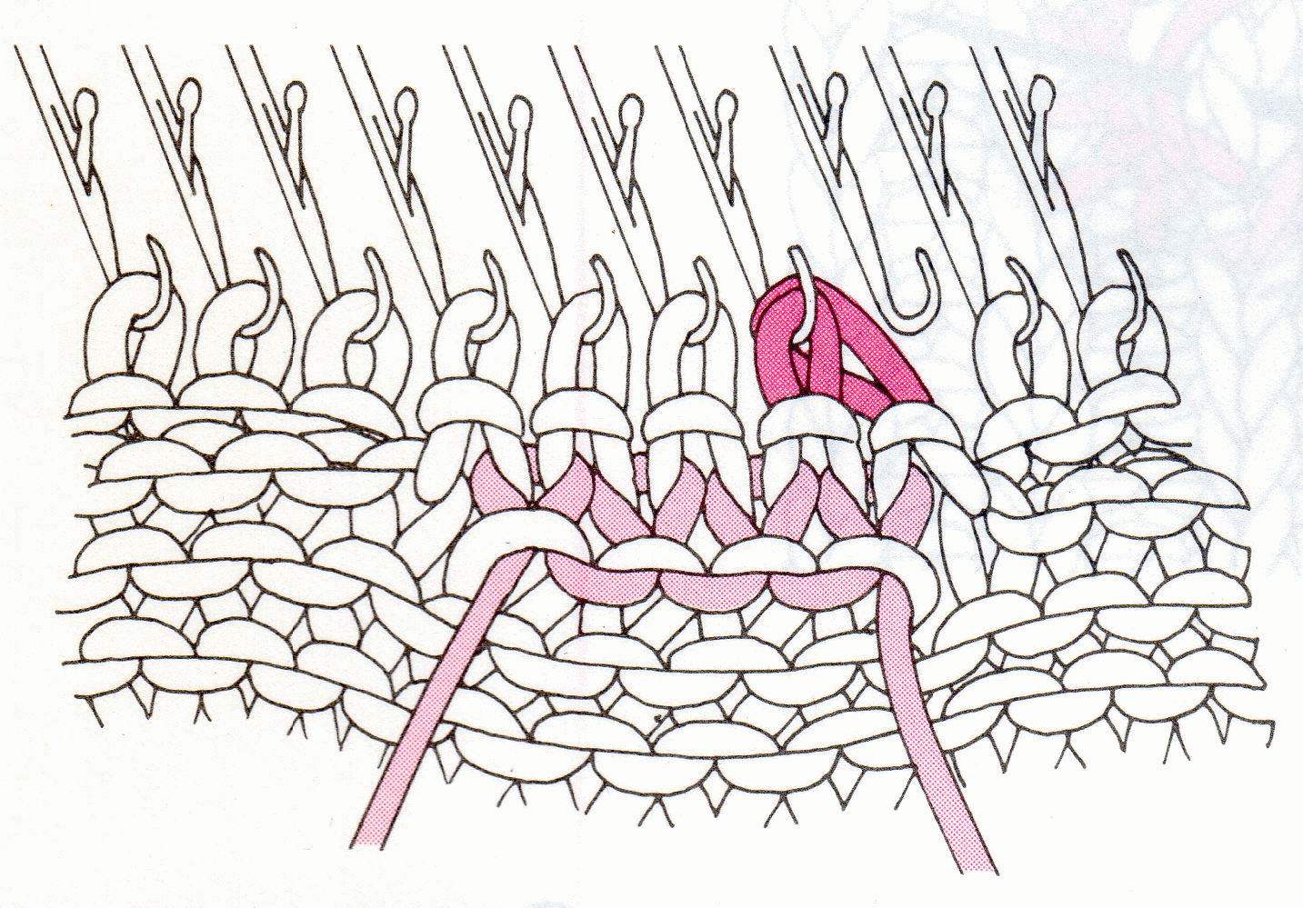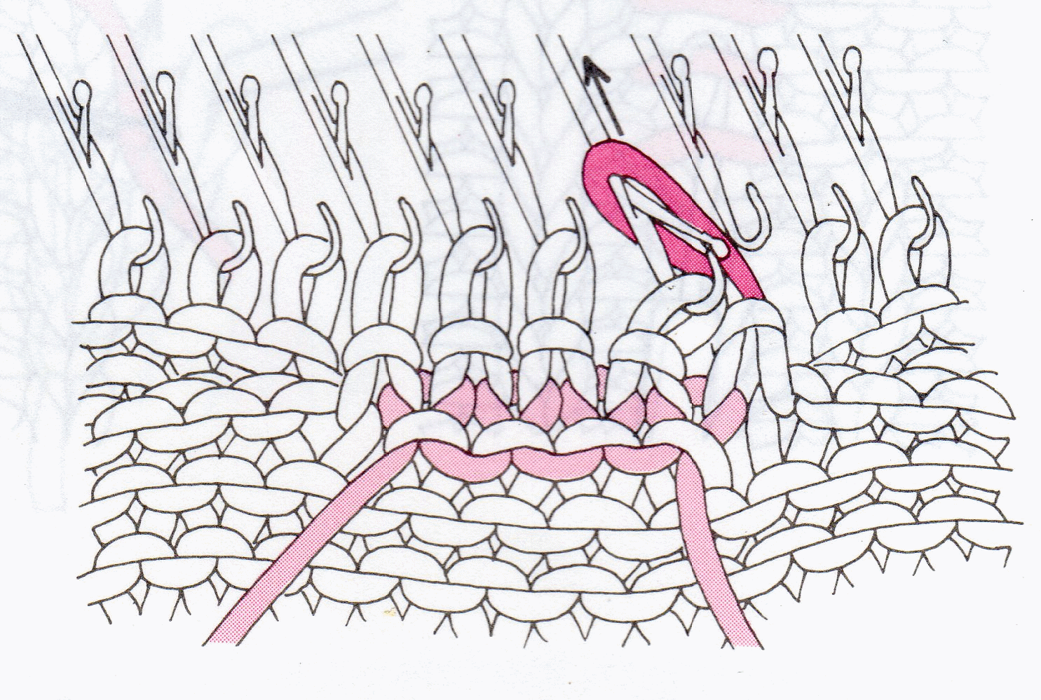Push these 5 needles back so that the picked up loops go through the stitches. There should now be just one stitch in each hook.