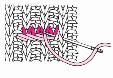Thread a tapestry needle with a 15″ length of main color yarn. Insert the needle from back to front through the center of the first stitch left of the marked buttonhole stitches. Make a backstitch, inserting the needle into the center of the first main color stitch below the marked stitches, then come back out through the first stitch just to the left.