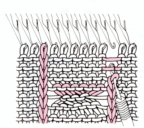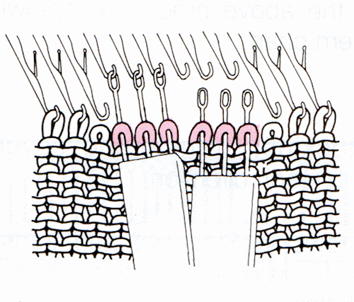 Drop the stitches for the purl columns and ravel them down to the beginning of the cable section. If you began by reforming 2 rows at the beginning, as suggested in the tips above, this will be very easy. If you did not set up your knitting this way, be careful when nearing the beginning. Insert the latch tool into the stitch in the correct row, then ravel the last two or three rows with the latch tool in the stitch. Latch this column of stitches as purl, and rehang the last one on the corresponding empty needle.