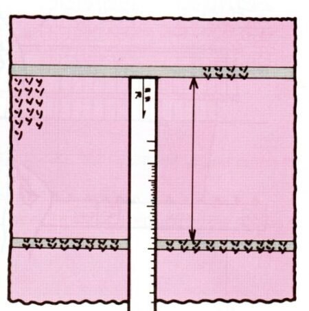 The number on the scale, just to the inside of the contrast stitch, is how many stitches there are in 10 cm, or 4″. Divide by 4 for the number of stitches per inch. Be sure to include any fraction of a stitch.Write this down.
