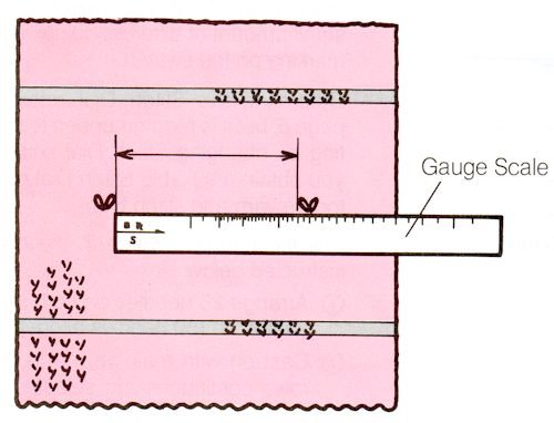 Turn the gauge scale with the S side up. Lay this end next to one of the contrast color stitches in the center of the swatch. This should be just to the inside of the contrast stitch. Adjust the scale so that the top edge just touches the bottom of the other contrast stitch.