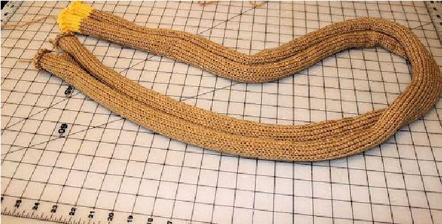 This is what a length of stockinet fabric typically looks like when removed from the machine. The long edges curl to the purl side quite severely.