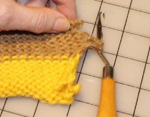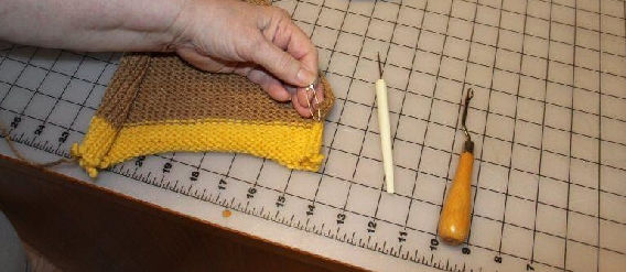 You will also need 2 safety pins, and if at all possible a rug latch hook. It looks very much like a large latch tool, but is much easier to use for seaming. These are available in most yarn shops and craft sections of stores like Walmart and JoAnn’s. You can also use the latch tool that comeswith your knitting machine, or a large crochet hook if a rug latch hook is not available.