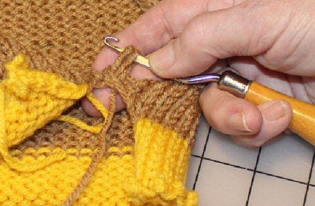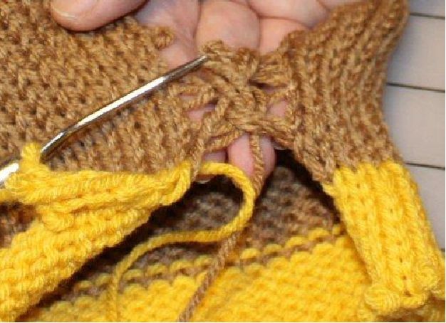 Remove the safety pin from the right side of the scarf. Using the tip of the hook, pull out the edge stitch. This creates one long loop on the edge. Pull out another loop on the edge, then slide both of them down behind the latch.