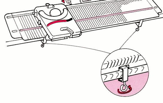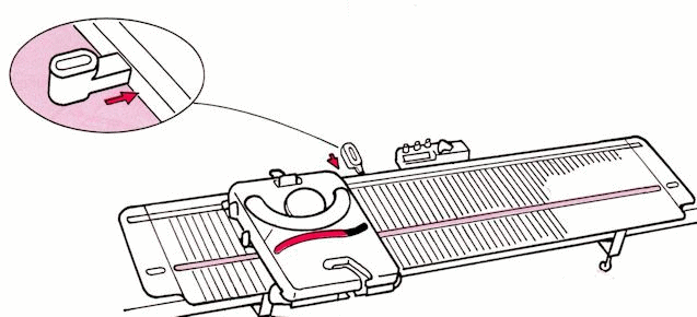 The carriage comes already installed on the needle bed on a new machine, but used ones will frequently come with the carriage removed. To place carriage on needle bed, use either of the following methods.