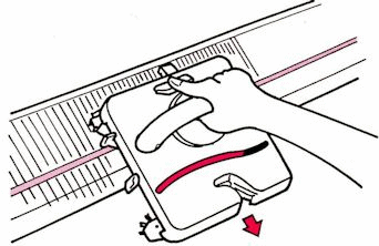 1. Place the carriage level with the needle bed, with the groove at the rear of the carriage, A, in line with the rail at the back of the Needle Bed. Bring the groove on the rear of the carriage over the rail and slide into place.