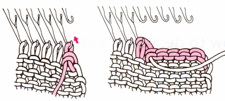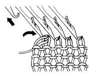 Push needle back so that the yarn strand goes through both yarn loops. This creates a new single stitch on end needle.