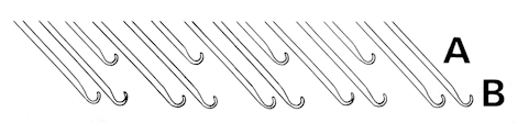 To begin, bring 20 needles out to position B. Starting with needle 3, push every 3rd needle back to position A, out of work.