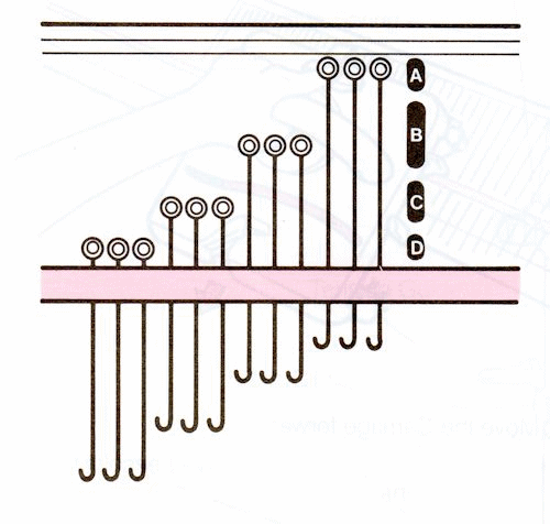 When the Russel levers are pushed backwards to l, the needles in position D will not knit; the yarn simply passes over the top of the needle as the carriage goes over them. This is used for short row shaping, and also to create tuck stitch patterns.