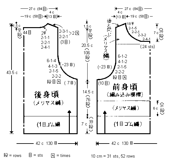 At the lower right of the chart is a notation that 10 cm = 31 sts, 52 rows. I don’t know any current yarn that will match this exact gauge. The old Nomis 3/15 coned yarn would match the stitch gauge, but probably at 44-46 rows. Lightweight sock yarn would also come close. If you decide to actually knit a garment from this pattern, be prepared to do some re-figuring. You will almost certainly have to do some math, any way; this pattern is designed for someone with a 33″ bust measurement. But the object of this lesson is just to learn how to read a Japanese pattern.