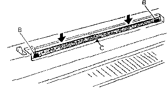 Insert the correct Stitch Scale into the Stitch Scale Clip, “B” on the diagram. Be sure that the scale actually goes under the clips. For the KR-7 model, line up the center 0 on the scale with the center mark on the Knit Contour (Poin t “C”).