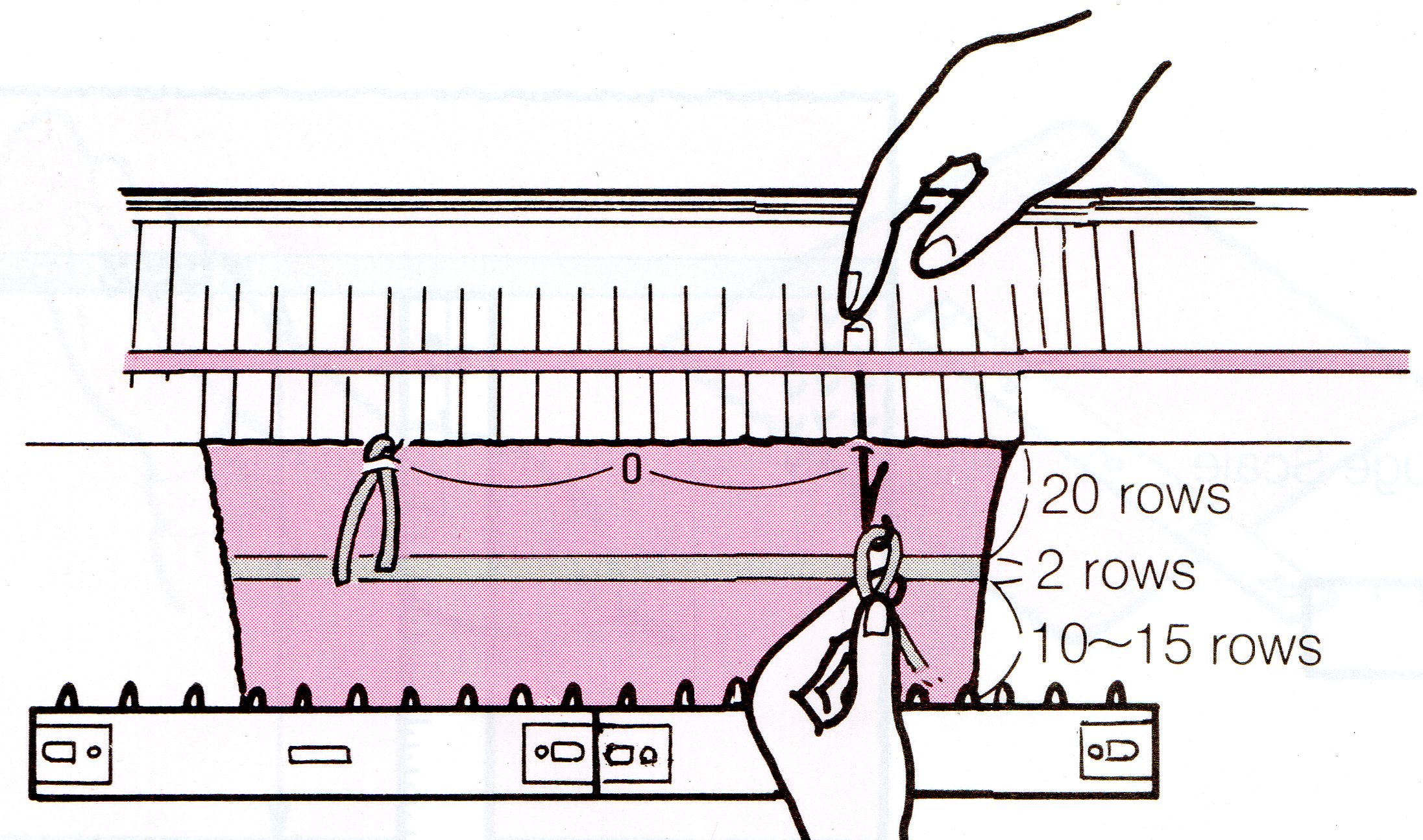 Knit another 20 rows main color. Change to contrast color and knit 2 rows. Change back to main color. Knit 6 rows. This step is not shown in the manual, but it is very helpful. Make an eyelet for each number on the stitch dial. Example: if you have been knitting at tension 6, make six eyelets by transferring the stitch to an adjacent needle and returning the emptied needle to work position. If the tension dial was set at the dot between numbers, skip over several stitches and make a single eyelet to represent the dot. Knit 4 rows and bind off.