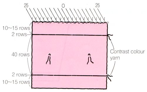 Cast on 50 stitches, 25 on each side of center 0. Knit 10 rows in pattern stitch for the garment to be made; this tutorial is for stockinet, but use slip, tuck, or fairisle if that will be what is used in your garment.