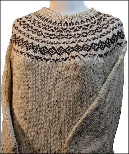 This was the first KnitAlong pattern for round yoke pullovers. It did not include Fairisle pattern on the sleeves or bottom of body.