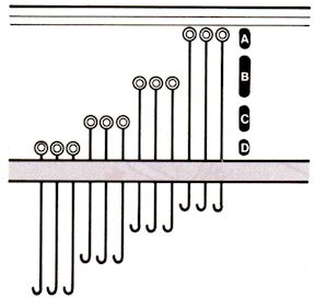 Each position provides a different function for the needles. Those in position A do not knit, no matter how the carriage is set. This is most frequently called “out of work”, and is sometimes abbreviated OWP (out of work position). Needles in position B will knit Stockinette or pattern stitches, depending on how the carriage is set. This is called “work position” and is usually abbreviated WP. Needles in position C will knit Stockinette only. This is called “upper work position” and is abbreviated UWP. Needles in position D do not knit when the Russel Levers are set at l (backwards), but do knit when they are set at ll. This is “hold position” and is abbreviated HP.