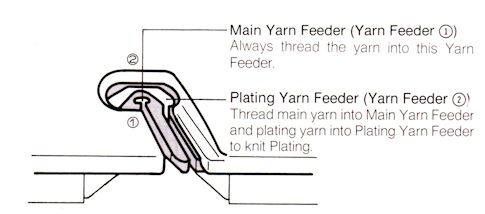 If knitting with just one yarn, always place it in feeder #1 (the front slot). When plating, place the main yarn (the yarn you want to be seen on the “public” side of the fabric) in feeder #1, and the plating or “lining” yarn in feeder #2. This seems backwards, but the machine really knows how to sort it out. Try this on a sample to see for yourself.