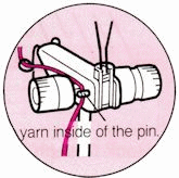 4. Thread the yarn from back to front through the eyelet in the tension spring. Pull the spring down first, then thread yarn end through towards you.